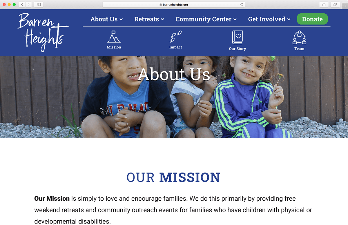 When serving families of children with special needs is your mission, having a website that shares your heart to serve while giving guest families and volunteers alike a clear path to follow is key. Barren Heights came to us with an outdated web presence and branding that did not match the fresh energy of their leadership. We let their beautiful candid photography and message of joy shine through in the design and user experience.