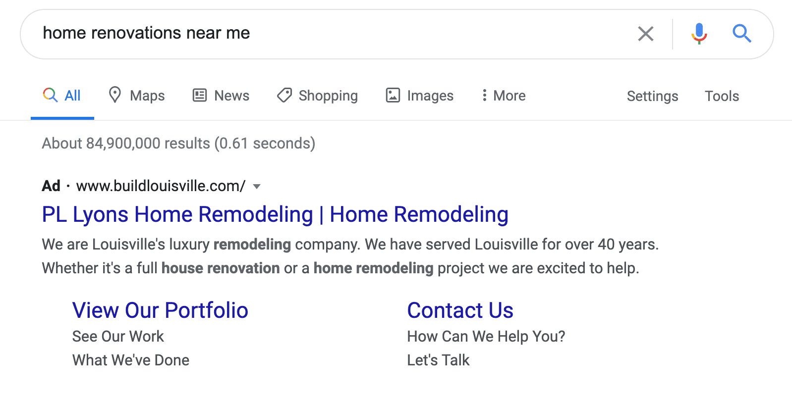 By paying to appear for specific key words like "home renovation" and "Louisville," PL Lyons is ensuring that they are the first option that you will see. This is paid search!